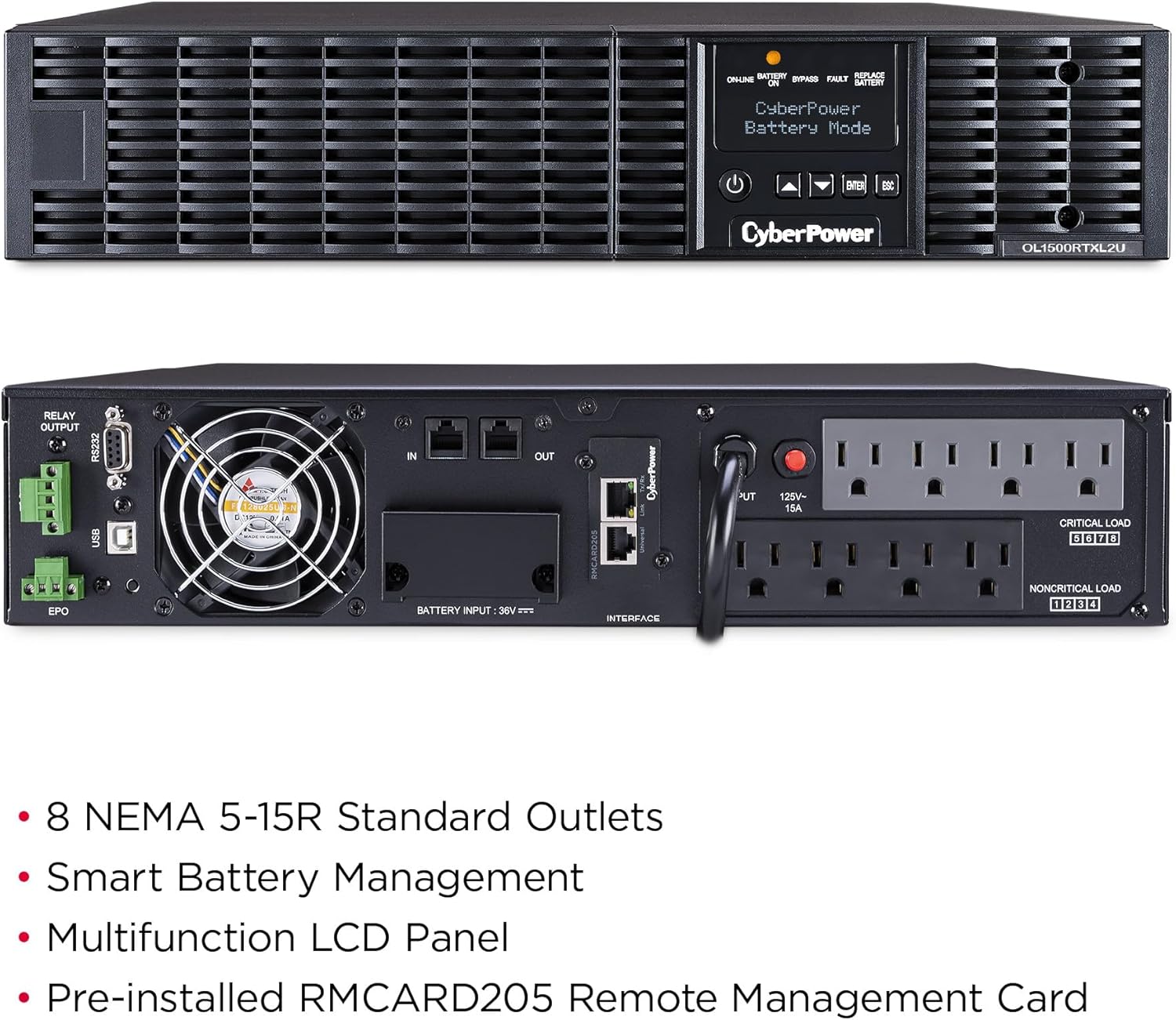 EBM OPTION: Up to ten optional BP36V60ART2U Extended Battery Modules can be added for expanded runtimes; EXTENDABLE MULTIFUNCTION LCD PANEL: Displays UPS statuses and customizable operating settings up to 10 feet away